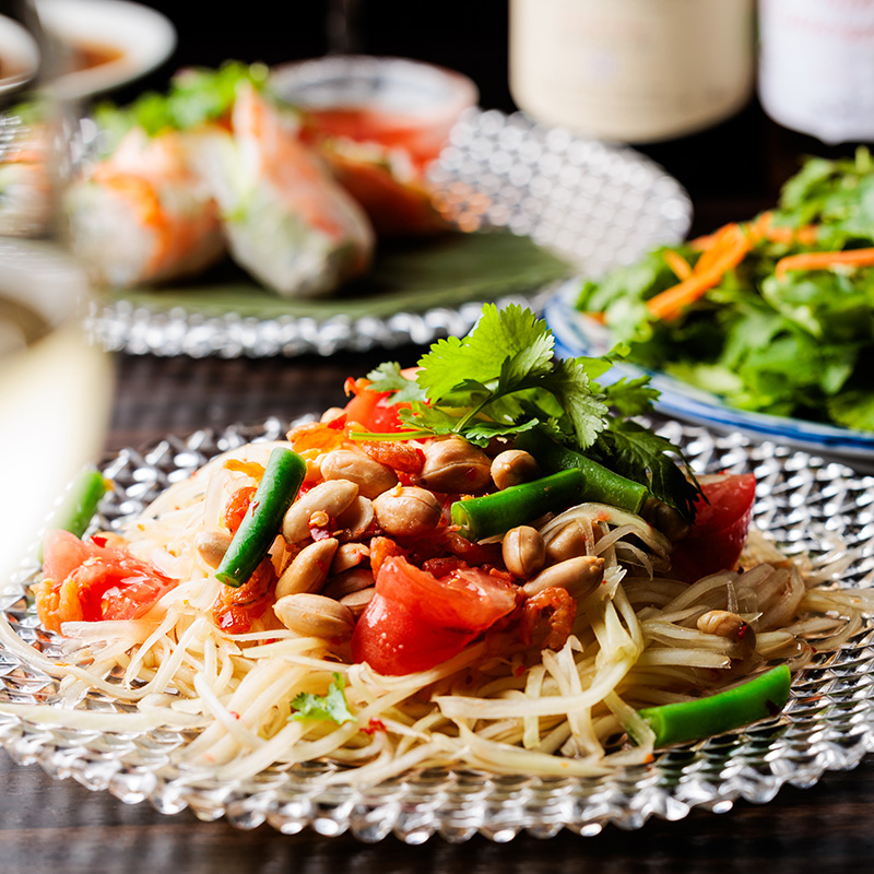 (スモークサーモンの生春巻き、タイ式さつま揚げ、エビ春巻き)